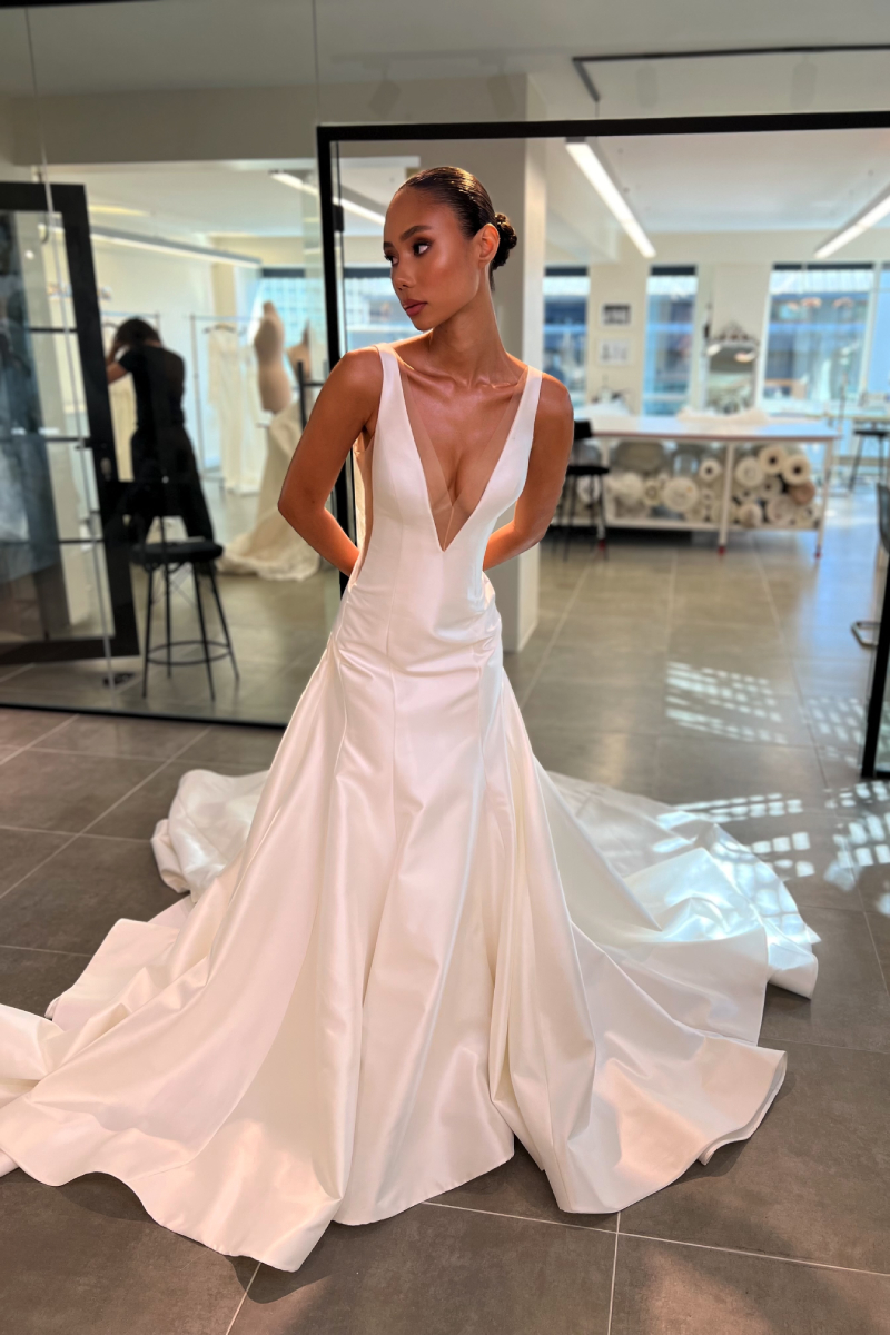 Kod: FD0255A Form wedding dress with deep V neckline and long tail, made from Ziberlin fabric.Color: Cream