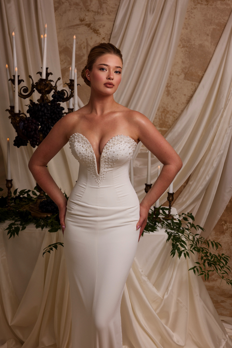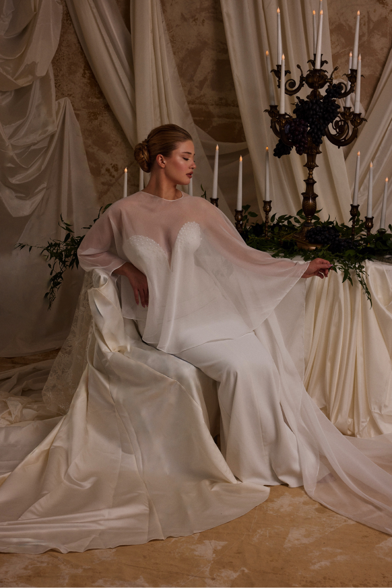 Fish-shaped wedding dress with original pearl embroidered silk crepe fabric, chiffon shawl and dual use.